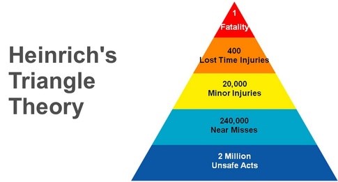 H. W. Heinrich’s work in Industrial Accident Prevention was first published in 1931. It was one of the first occasions in Industrial Safety that looked at the relationship between hazard/near misses and incidents resulting in harm. One concept that has been widely embraced and developed by others is the accident triangle: the hypothesis that rather than focus on the few injuries at the top of the triangle to learn how to avoid major and, in particular, catastrophic loss, we should focus on the many accidents or near accidents at the bottom or base of the triangle. (Anderson, M. 2010). Heinrich’s Triangle is shown in Figure 1.