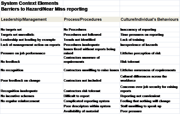 Improving hazard/near miss reporting though is a complex issue and should be seen within a systems context perspective. There are many aspects that would influence an improvement in hazard/near miss reporting and these factors are shown in Appendix 1. To give a better understanding of the level and high degree of interaction across so many facets and how they are related, free hand drawn arrows demonstrate the connections between the various factors and Table 1 has grouped them into three areas for ease of reference. These three distinct emerging groups have been headed as follows but within the systems context they are also dependent on the other two groupings;