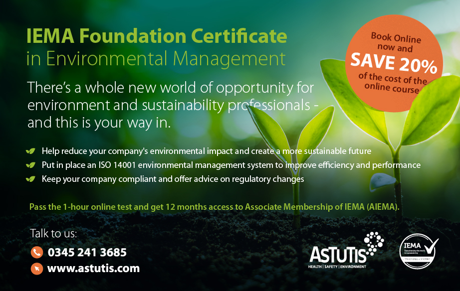 To meet the growing demand for such expertise, Astutis has launched a new online version of the IEMA Foundation Certificate in Environmental Management. The new online course is suitable for those starting a new health and safety job in environmental management who want a develop a solid knowledge of governance principles alongside the breadth of the sustainability agenda.