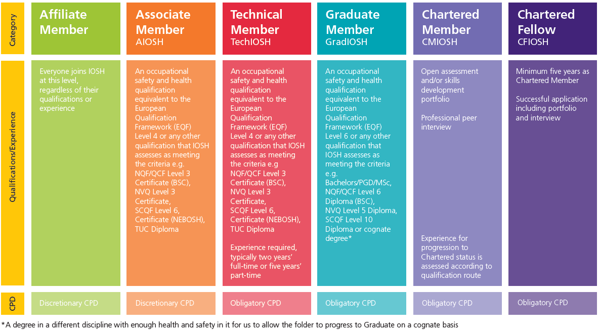 In order to become an associate member of IOSH, you must have acquired an occupational safety and health qualification that is equivalent to the European Qualification Framework Level 4. Professionals can also put forward any qualification IOSH uses to assess against the entry criteria.